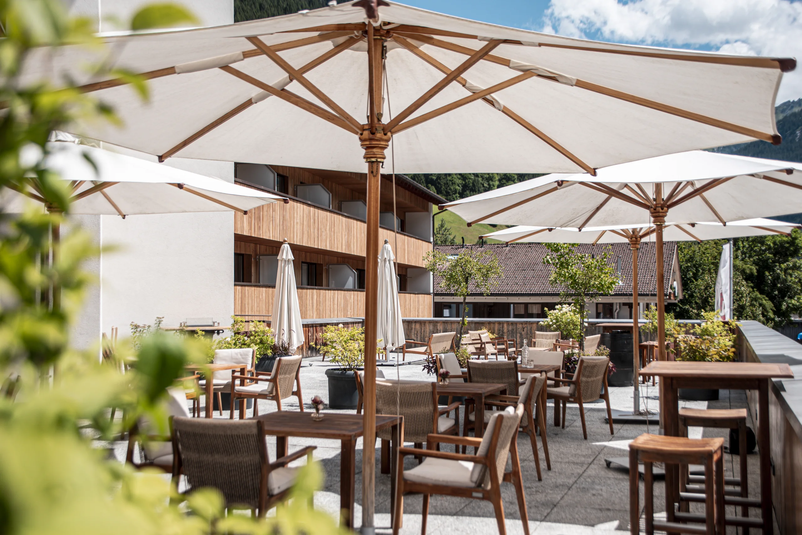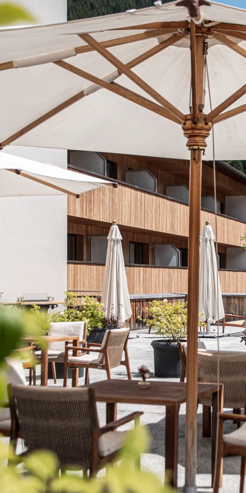 Terrasse mit Holzstühlen und großen weißen Sonnenschirmen bei sonnigem Wetter