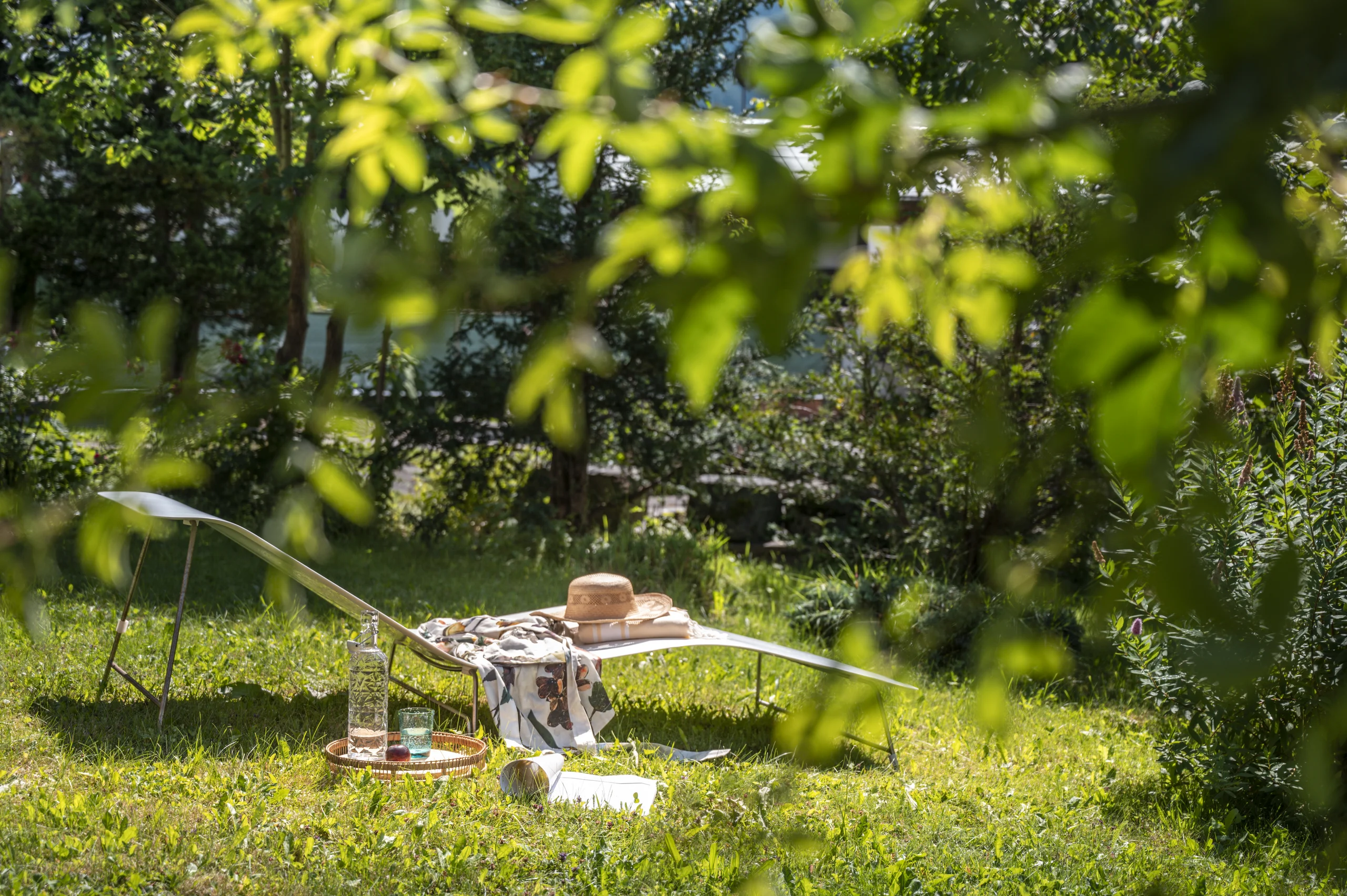 Liegestuhl mit Hut und Getränken in sonnigem Garten